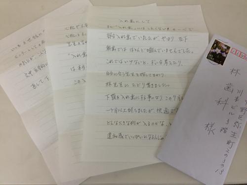 先日、下顎の入れ歯を入れた患者さんからお手紙を頂きました。入れ歯は入れた時からが本当の始まりなので、その後の診療のたびに微調整などと一緒にご本人の実感などを伺うのですが、こうして文章で頂けるとやはり嬉しいものです。