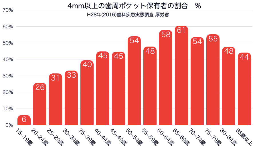 しかし一般の方に「歯周病はどのような病気なのか」とのアンケートを行ってみると、ほとんどの方が「歯と歯ぐきの病気」と答え、「歯ぐきと、歯を支える骨の病気」と正しく答えられる人の割合は、およそ1割強という結果があります。