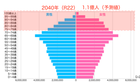 また、日本の人口ピラミッド図(総務省統計局・2021年10月1日現在)を見れば、この傾向はますます顕著となり、生産人口は明らかに減少していくことがわかっています。つまり近い将来、日本の国体を維持するための人とお金が明らかに不足していくことを示しており、2040年には高齢者のさらなる増加と生産人口の減少が同時に起こるとされています(2040年問題)。