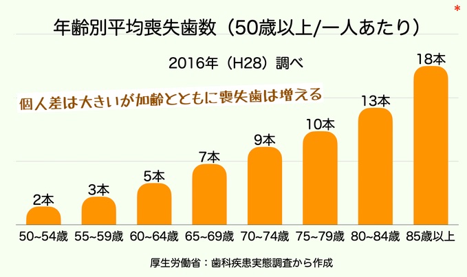 歯にも耐用年数、つまり寿命があります。長生きをすれば、どんなに磨いていても結果的には一本ずつ失っていくものです。 厚生労働省による「平成23年歯科疾患実態調査」によれば、1人平均喪失歯数が40~44歳までで0.9本、45~49歳では1.5本になります。つまり45歳以降では日本人は平均すると歯が1本以上欠けているのが当たり前なのです。歯を失えば補わなければ・・ 【続きを読む】