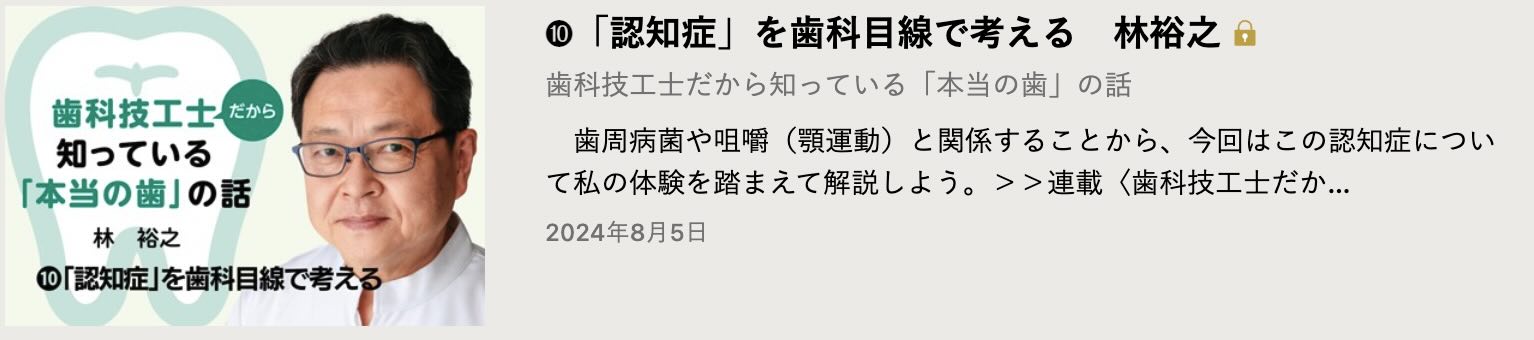歯周病菌や咀嚼(顎運動)と関係することから、今回はこの認知症について私の体験を踏まえて解説しよう。