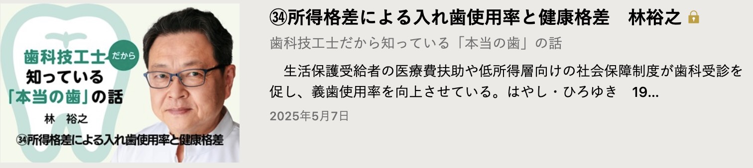 前号で、「65歳以上で歯が19本以下の高齢者の義歯使用率には所得格差がある」とした宮城県岩沼市の調査を紹介しました。